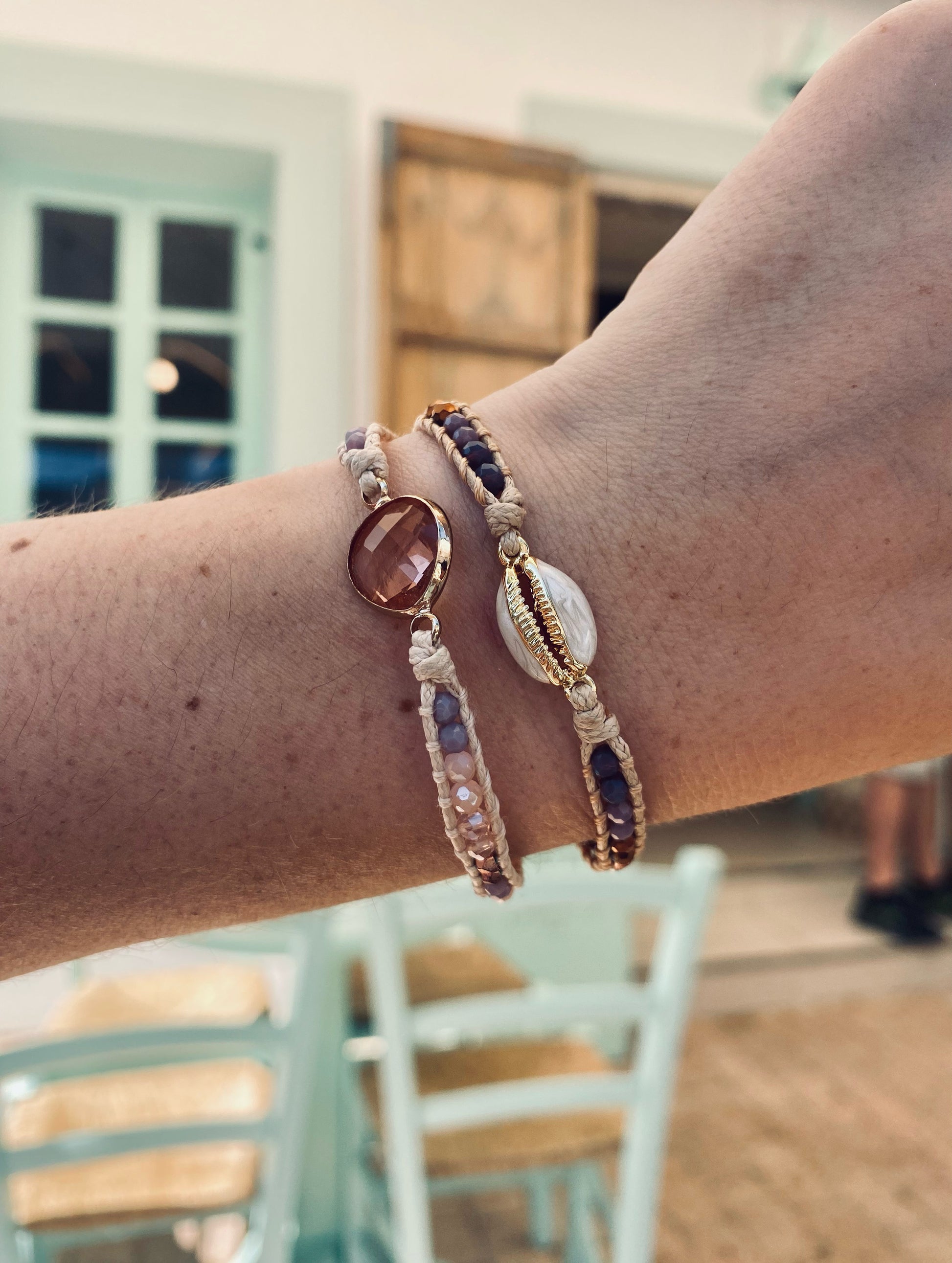 - Armbandje handmade in Ibiza, verkrijgbaar in diverse kleuren met steen of schelp.